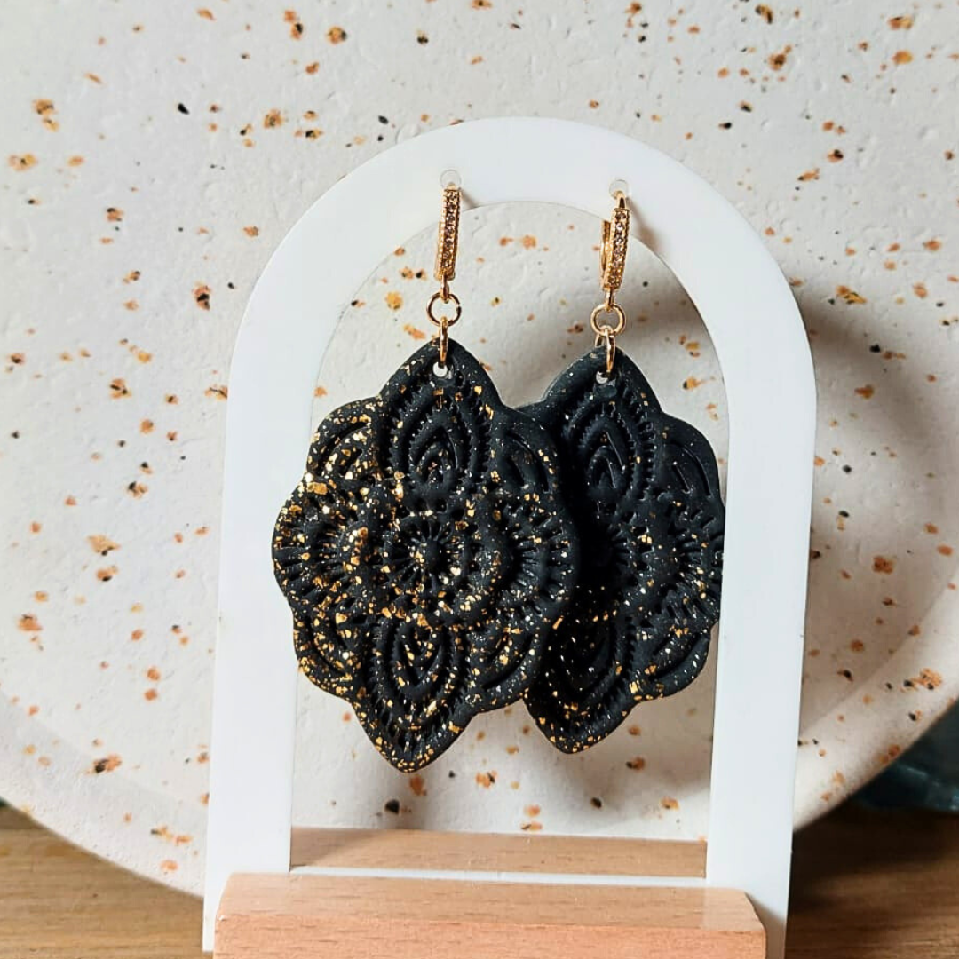 Boucles d'oreilles bohèmes noires/dorée en argile polymère