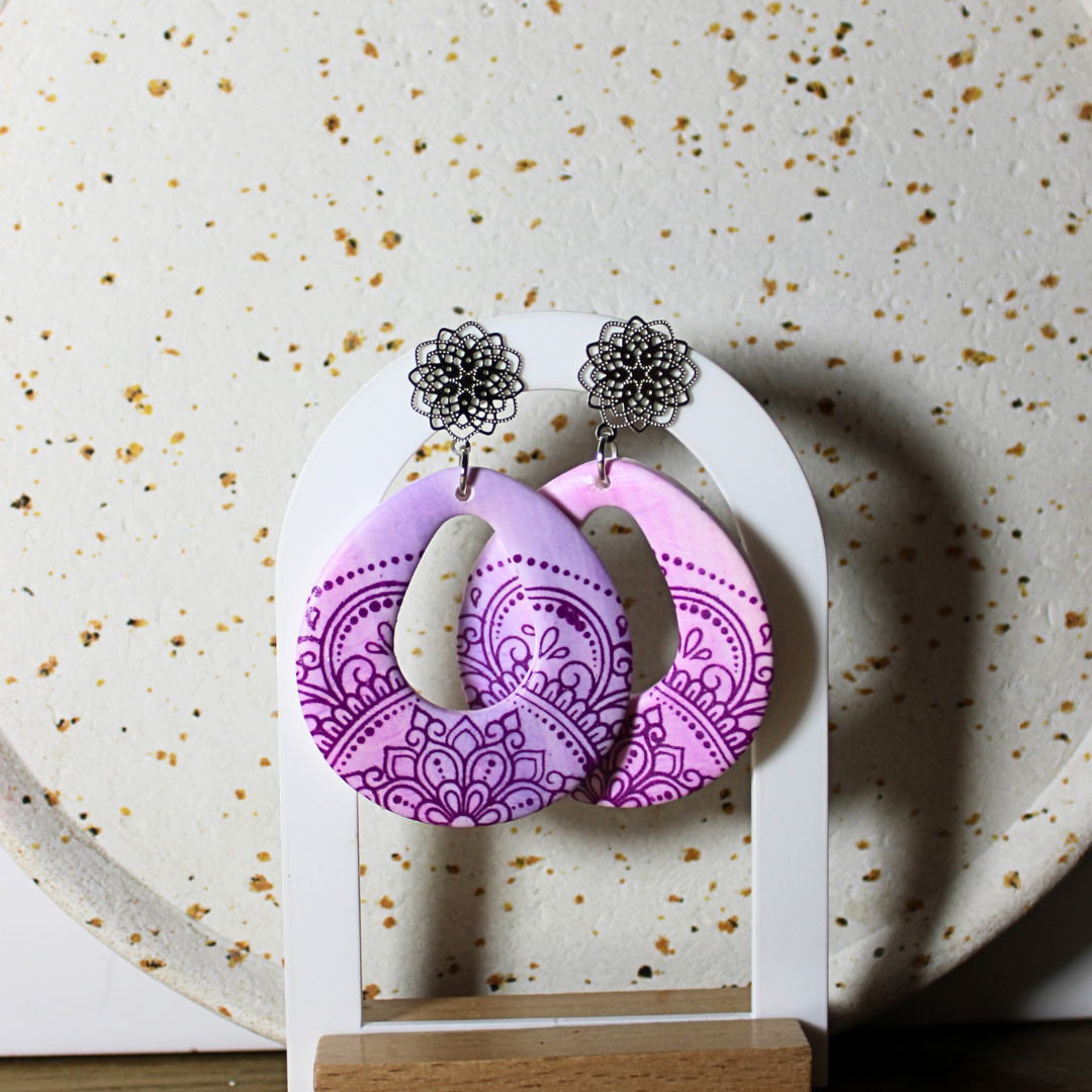 Boucles d'oreilles en argile polymère. Rose/violet/argenté